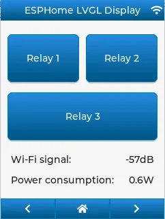 lvgl: ... top_layer: widgets: - buttonmatrix: align: bottom_mid styles: header_footer pad_all: 0 outline_width: 0 id: top_layer items: styles: header_footer rows: - buttons: - id: page_prev text: "\uF053" on_press: then: lvgl.page.previous: - id: page_home text: "\uF015" on_press: then: lvgl.page.show: main_page - id: page_next text: "\uF054" on_press: then: lvgl.page.next:For this example to appear correctly, use the theme and style options from above and LVGL’s own library fonts.